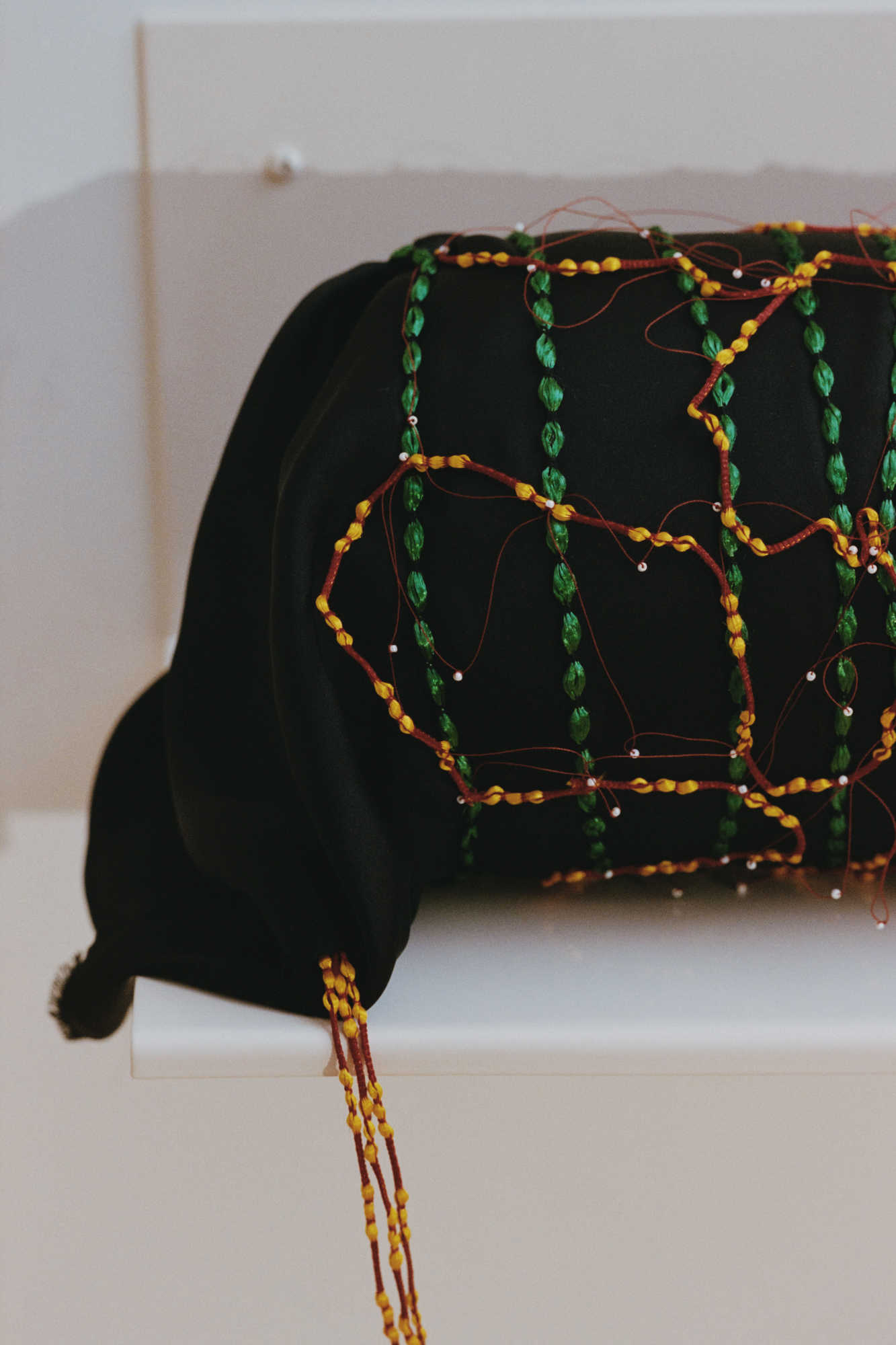 Silk, pearls, polyester filling, polyester ribbon, cotton thread