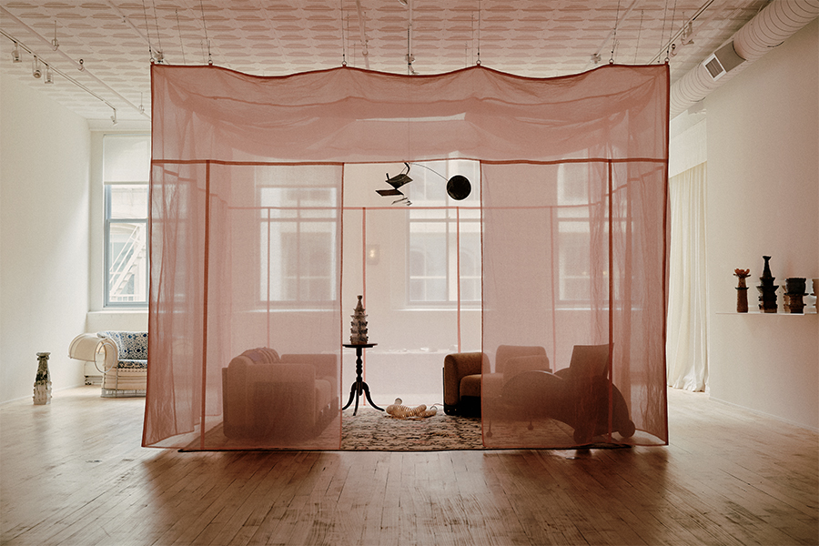 A Room is an Archive of Touch is an intimate and personal exploration into complex and fraught representations of both memory and domesticity. Inspired by the poet and essayist Lisa Robertson's work Occasional Work and Seven Walks from the Office for Soft Architecture, particularly the essay "Atget's Interiors", in which the author remarks, "a room situates a cadence of habit", this exhibition demonstrates the way in such cadence can construct an archive as a testament and record of the past through gestures and intuition. Her notion of the passivity of interior spaces is thought-provoking – the way in which rooms and objects receive us, hold us and challenge us. Historical furniture and objects exhibit their own pasts of ritualistic patterns and everyday ceremonial use, and Grace Atkinson, Jennefer Hoffmann and Natalie Weinberger interpret and express this notion through their own unique and proprietary expressions of the often painful, yet beautiful and joyful, acts of "remembering".